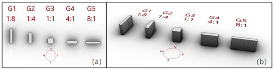 (a) Top-view and (b) perspective view of skyscraper farm geometries G1–G5 with corresponding side ratios. All buildings had 20 floors with 5 m inter-floor height.
