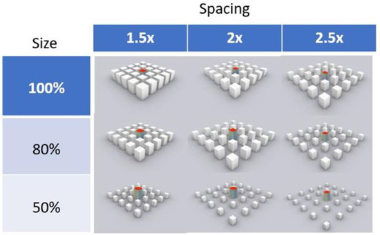 Nine urban scenarios were considered for two U.S. locations—New York City (NYC), and Los Angeles (LA). All modeled farms in the “skyscraper farm in a city” (SIC) scenarios were located in the center of an urban environment ranging in size and density of surrounding buildings. The farms modeled in the SIC scenarios had the same dimensions as Geometry 3 (G3) in the ‘SIF’ section above i.e., a square area footprint. Each level of the building was discretized into grids of 2 m × 2 m squares, with light levels recorded in the center point of each grid hourly throughout the year. Nine conceptual urban settings were modeled varying the size and proximity of the surrounding rectangular buildings. The size and spacing of neighboring buildings in each urban setting was defined relative to the size of the target skyscraper farm; the variety of size and spacing levels is depicted below. The spacing between neighboring buildings was parameterized by the width of the building—the notation “2.5 × spacing” signifies that the distance between the farm and the nearest building (center-to-center) was 2.5 times the width of the farm (Figure 2). The sizing of neighboring buildings in each scenario was parameterized by the length scale of the farm, meaning the notation ‘80%’ means that the height and width of neighboring buildings were 80% of the height and width of the farm, i.e., 80 m high, 50.9 m wide. Detailed parameters and notations of each urban scenario are described in Table 1.