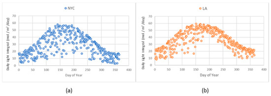 In terms of photosynthetic light provided by the sun, the mean DLI values on each level of the skyscraper farms in the SIF scenarios were significantly below the target level of 17 mol·m−2·day−1 (Table 1). However, it is important to note that mean DLI does not directly reflect lighting requirements because any light over the DLI target will influence the mean value but is not considered ‘useful’ for offsetting supplemental lighting. For example, the mean DLI in a GH in NYC is greater than the DLI target of 17 mol·m−2·day−1, though there is still a requirement for supplemental lighting to meet lighting targets periodically throughout the year (i.e., in summer there is too much light, triggering shading, in winter there is not enough light, so supplemental light must be added). As shown in Figure 3, the two locations, NYC and LA, received similar maximum DLIs at around 60 mol·m−2·day−1 on some of the sunniest days of the year (Figure 2), however, the specific weather conditions of each location affected the distribution of useful natural light throughout the year. Though LA is generally sunnier than NYC, both locations would require supplemental lighting to consistently meet a modest DLI target.