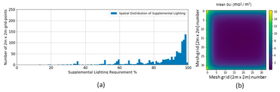 The required supplemental lighting at each grid-point for each day was calculated as the difference between DLI available each day and the target DLI of 17 mol·m−2·day−1. The supplemental lighting for a particular day and location is 0 if the DLI on that day is greater than the target. The calculation for supplemental lighting assumes perfect knowledge of future light availability. In practice, the stochastic nature of weather patterns does not allow for completely accurate prediction of future available natural light. However, this assumption is useful because it does provide a best-case scenario or a lower bound for the lighting energy consumption to meet the DLI target.