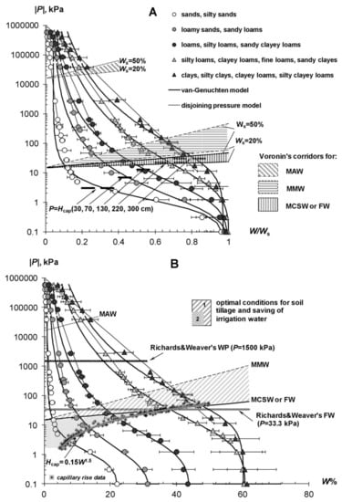 Figure 4B) corresponds to optimal conditions for soil tillage, as well as for saving water resources in irrigation agriculture, since water in this range is still available to plants and has a maximum concentration of nutrients (maximum osmotic pressure) with minimal unproductive losses to subsoil runoff and evaporation. We extended this range with respect to the Voronin approach (