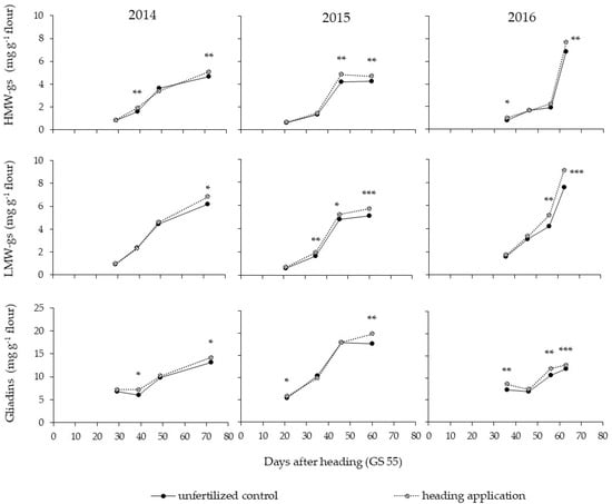 The effect of N fertilization at heading on the accumulation of HMW-gs, LMW-gs and gliadins during ripening is reported in Figure 1. All the gluten extractable protein fractions increased progressively from the milk stage (GS85) to commercial maturity (GS99). The late N fertilization significantly increased the HMW-gs, LMW-gs and gliadins at the last harvesting time, compared to the control, for all 3 years, but significant benefits of this practice were also observed within the 3 years for earlier maturity stages. The rise in the glutenin and gliadin fractions during ripening showed a similar trend in 2014 and 2015. However, a greater increase of glutenins was observed in 2016, the growing season with the highest soil N availability, in the last ripening stages than in the gliadin fraction.