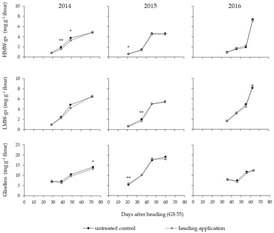 Compared to the role of late season N, the fungicide application at heading led to a lower impact on the contents of the different gluten protein fractions during ripening (Figure 2). Thus, the increase in the gluten protein fractions occurred similarly in the wheat treated with fungicide and in the untreated control. Overall, a significantly lower concentration of glutenins was detected at the earlier ripening stages after a fungicide treatment. Only in 2014 were the gliadins at the commercial harvesting stage significantly higher in the untreated control than under the fungicide treatment conditions.