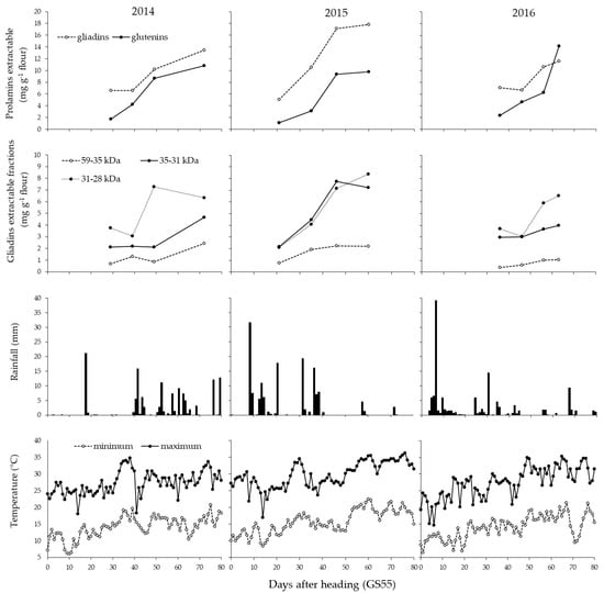 The effect of the meteorological trend during the ripening stages on the gluten protein fractions, on the accumulation profile of the total extractable glutenins and gliadins and on the latter one in particular, as well as on their separation into different sub-units was specifically investigated and reported for the untreated control over the 3 years, without a late N fertilization or fungicide application at heading (Figure 3).