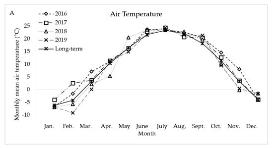 Mean temperature in 2017 and 2018 spring (March–May) was similar to the 30-year average, whereas the average spring temperature was slightly greater than the 30-year average in 2016 (Figure 1). April and May 2018 were considerably drier than the long-term average. Summer temperatures (June–August) were consistent with the long-term average; however, summer of 2017 and 2019 was very dry receiving 22 and 12 cm less rainfall than the long-term average, respectively. June and August in 2018 were very wet and received 15 and 9 cm, respectively, more precipitation than the long-term average. Fall temperatures (September–November) in 2016 and 2017 were slightly warmer than the long-term average. Fall precipitation was greater in all study years except 2017. Mean winter temperatures (December–February) were similar to the long-term trailing average except in 2017, which was 4 °C warmer. Overall, winter precipitation through snow and rainfall accumulation did not vary greatly.