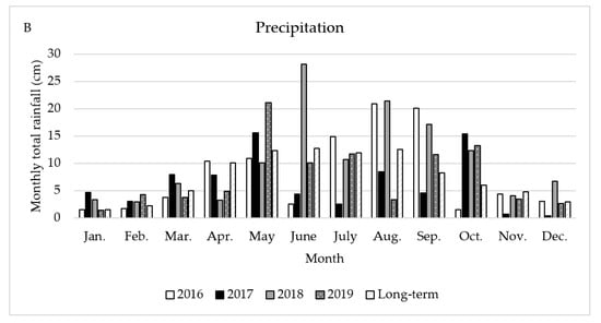 (A) Monthly mean air temperature for 2016, 2017, 2018, 2019, and long-term average for Ames, IA, USA, and (B) total precipitation for 2016, 2017, 2018, 2019, and long-term average for Ames, IA, USA.