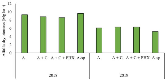 The corn harvest index (HI) in both 2016 and 2017 was not affected by alfalfa intercropping. Corn harvest index was 66 and 64 in 2016 and 2017, respectively (Table 5). These HI values were within the range of values reported by previous studies [45,46]. Aboveground biomass and grain yield in 2016 were not different (p ≤ 0.05) across treatments in 2016 at 29 and 13.6 Mg ha−1, respectively. In contrast to 2016, for the study established in 2017, corn aboveground biomass and grain yield were 24% and 24.5% less, respectively, when intercropped with alfalfa (with or without PHX application). Corn grain yield did not correlate significantly with alfalfa stem density or alfalfa yield in either of the alfalfa seeding years of 2016 and 2017 (results not presented).