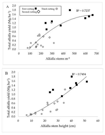 Alfalfa biomass yield increased as stem density and stem height increased in the seeding year for both studies (Figure 4), with a coefficient of determination of 0.724 and 748, respectively. There was no discernable relationship between total alfalfa biomass yield and alfalfa stem height at PHX application. Alfalfa biomass yield also increased with stem density and stem height, in the first harvest of the first production year (data not presented). Alfalfa biomass yield was inconsistently correlated with stem density and stem height after the first harvest in the first production year for subsequent years and cuttings for both studies, with the exception of alfalfa height, which maintained a stronger positive correlation with alfalfa biomass yield in all of the first production year cuttings for the 2016 study and first two cuttings for the 2017 study (data not presented). Grabber [11] also reported an increase in biomass yield with greater stem density.