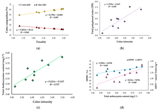 Correlation between color composition (Y, R) and tonality (a); correlation between color intensity and phenolics index (b); correlation between color intensity and total anthocyanins (c); and correlation between total anthocyanins content and antioxidant activity (ABTS•+, DPPH•) (d).
