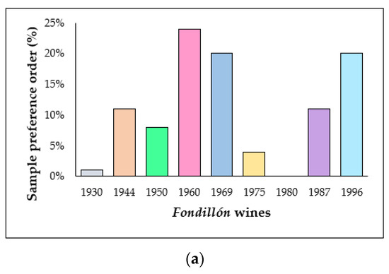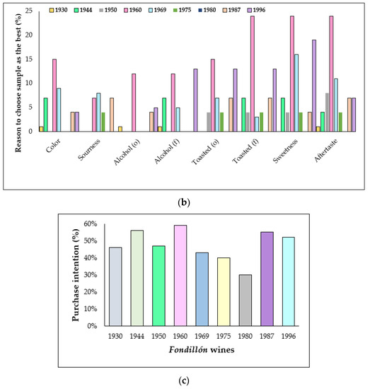 Figure 2a shows the preference percentage of the Spanish consumers for the Fondillón samples under study, and Figure 2b the reasons why they chose their preferred sample. The Fondillón solera 1960 was chosen as the most liked one (24%), mainly because of its color, its toasted (woody) odor and flavor, its sweetness, its toffee and coffee notes, and its long aftertaste. Besides, the wine obtaining the highest purchase intention (59%) was that of the solera 1960 (Figure 2c), with sample of solera 1980 being on the opposite side (30%).
