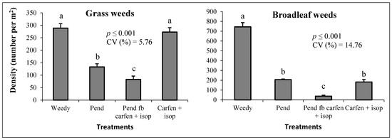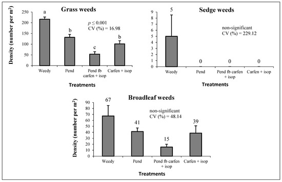 | Treatments | Total Weed Density (no. m−2) | Total Dry Biomass (g m−2) | ||