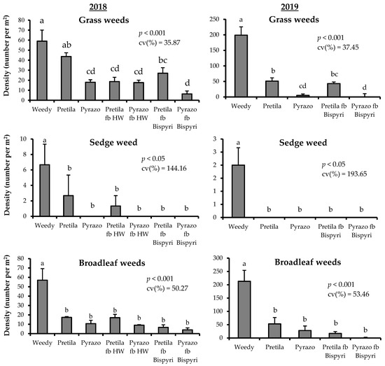 | Weedy check | 271 d | 293 c | 261 c | 241 d | 120 c | 159 b | 4.88 e (−36.0%) | 4.22 d (−40.1%) |