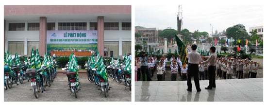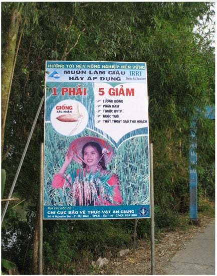The roll-out of 1M5R in November 2009 occurred at the front of the People’s Committee Building of An Giang province, with a 20 × 10 m banner promoting the event (Figure 3). The vice-chairman of the People’s Committee, the deputy director of the National Plant Protection Center, the director of the provincial department of agriculture and rural development and three IRRI scientists, were among the people who attended the launch. Moreover, the private sector, with an interest in fertilizers and other inputs, was represented in the event [33]. There was strong media presence and, after the formal launch, 50 riders with 1 Phai 5 Giam banners set off in formation to tour the city and then tour three other provinces over the next two days. During the previous week, there were 20 billboards (Figure 2) erected in the province, plus 2000 posters displayed in public sites such as schools, coffee shops, farmer clubs, and hospitals. There was a print run of 17,000 brochures and 8000 manuals. 1M5R received an impressive launch!