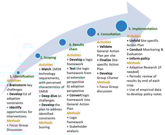 More specifically, the strategy provided a 5-step procedure to guide learning activities. The stepwise procedure is as follows: Identification, Scoping, Results Chain, Consultation, and Implementation (Figure 4). The first three steps involved local extension staff, and the last two steps engaged farmers to analyze and address site-specific issues to promote solutions and adoption (Figure 4). By participating in these five steps, an action plan was produced to enable both local extension workers and farmers to agree on what actions were to be taken, by whom, and how these actions were to be monitored or adjusted during the adoption process. The action plan embraced the five stages of adult learning and was instrumental in assisting the farmers in implementing and achieving the sustained adoption of 1M5R.