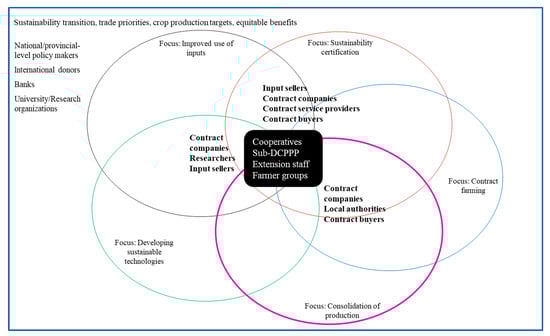 Scaling entails a reconfiguration emerging from interactions between biophysical, social, economic, and institutional changes in a socio-technical system [13]. Different actors, institutional arrangements, rules, and technologies comprise this socio-technical system. Intermediary actors are crucial and play roles in knowledge provision and translation, technology development, and public and industry processes [14,15,16]. There are systemic intermediaries who operate “in networks instead of ‘one to one’ mediation” [17]. They help to articulate the options and demand for knowledge, technologies or other processes, support the alignment of actors, and enable learning [18]. They also transform governance towards a transition process that can embed specific innovations in a system [19]. Linked to this are intermediaries that support the translation of new tools, techniques and processes within their networks [20]. These create new processes and incentive mechanisms. An example of this is contract farming. Mediated by the private sector, such contracts promote specific practices and provide incentives for these practices. In some cases, these intermediaries can be seen as cultural enablers because they re-create the social and organizational conditions that support an innovation. Lastly, there are also intermediaries that are focused on a niche or specialized product, service or market [21]. They connect experimental findings, or new ideas and products with the rest of the innovation system actors to enable changes to the current practices of varied actors. This is needed, as large-scale rice farming requires collective actions and alignment across different stakeholders in the value chain [22].