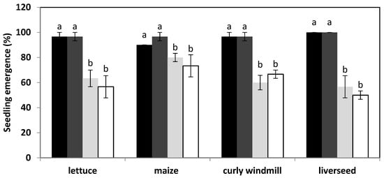 Seedling emergence percentage for lettuce, maize, curly windmill grass, and liverseed grass when seeds were sown into soil collected from a parthenium weed-infested site, either collected from the 0 to 10 cm (light grey) or 10 to 20 cm depth (white), and in soil collected from a non-infested soil collected from the 0 to 10 cm (dark grey) or 10 to 20 cm (black). Error bars represent two standard deviations from the mean, as calculated for 24 replicate pots of 30 sown seeds. Means within species that do not share the same letter are significantly different from one another at p > 0.05.