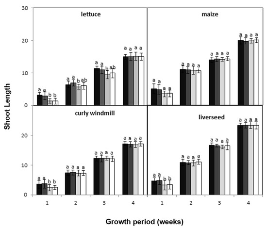 Shoot length attained by lettuce, maize, curly windmill grass, and liverseed grass seedlings when grown in a soil from a parthenium weed-infested site, either collected from the 0 to 10 cm (light grey) or 10 to 20 cm (white) depth; and from a non-infested soil collected from the 0 to 10 cm (dark grey) or 10 to 20 cm (black) depth. Error bars represent two standard deviations from the mean as calculated for three replicates of six seedlings in three pots. Means within species and growth periods that do not share the same letter are significantly different from one another at p > 0.05.