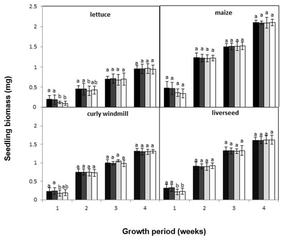 Seedling biomass production from lettuce, maize, curly windmill grass, and liverseed grass seedlings when grown in a soil from a parthenium weed-infested site, either collected from the 0 to 10 cm (light grey) or 10 to 20 cm depth (white) and from a non-infested soil collected from the 0 to 10 cm (dark grey) or 10 to 20 cm (black). Error bars represent two standard deviations from the mean as calculated for three replicates of six seedlings in three pots. Means within species and growth periods that do not share the same letter are significantly different from one another at p > 0.05.