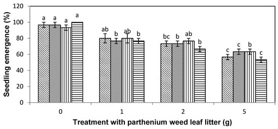 Seedling emergence from all test plant species was reduced by 20 to 40% when in soil containing parthenium weed leaf litter (Figure 4). This suggests that the leaf litter produced by one to two parthenium weed plants can reduce seedling emergence from other plant species that may be present in the seed bank. A major source of these chemicals is undoubtedly the aerial parts where certain allelochemicals are contained within the multitude of trichrome hairs that cover the surface of the leaves and stems that can be released directly to the soil during rainfall [29,30,31]. Additionally, continuing inputs of compounds may also play an important role in the growth inhibition under the field conditions where parthenium weed is growing with either crops or pasture species. Maize was least affected, while liverseed grass was most affected (Figure 4). This result is consistent with the previous experiments where the maize germination was least affected in terms of its germination and growth in soil collected from a parthenium weed-infested site [32]. In line with maize but in contrast with the other test species, another study [20] showed that parthenium weed leaf litter could not significantly reduce the germination of wheat or pea seeds.