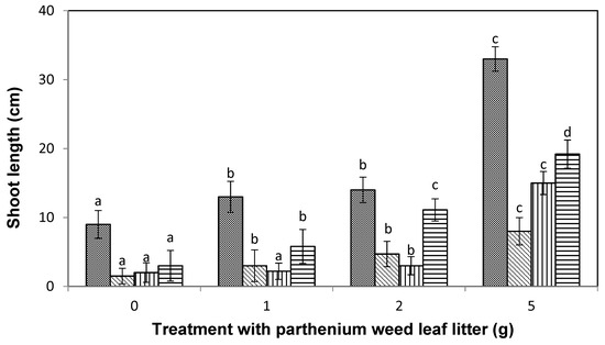 Following 1 week of growth, based on shoot length attainment (Figure 5) and biomass production (Figure 6), the further development of all test species was stimulated by the leaf litter, with the increase in biomass correlating with an increase in the amount of parthenium weed leaf litter used as the amendment (Figure 5). The reduction in the inhibitory effects may be due to the degradation of the allelochemicals from the leaf litter in the soil medium, as previously argued [24]; however, there were higher levels of C and N found in the plants grown with the higher level (5 g) of parthenium weed leaf litter than in samples with the lower levels (0 to 2 g) of parthenium weed leaf litter (Table 1). Most soil chemistry features examined in invaded sites have not been found to be significantly different to those of noninvaded sites [33,34,35]. However, soil nitrogen (N) dynamics, including N-mineralization and microbial biomass N, have been shown to be significantly different in invaded sites, including changes in the vegetation present in grassland communities [36]. Growth stimulation may be attributable to the fact that parthenium weed residues have been reported to contain high levels of N, P, and K [37], which could provide a fertilization effect to the growth of the test plants once the allelochemicals have broken down. In a previous study, wheat and pea seedlings showed higher initial growths in parthenium weed leaf-amended soils as compared to those growing in unamended soils; however, from 60 days after sowing, plants showed higher growth rates in unamended soil [20]. The compost used in this present study was fertilizer-free, so the effect of extra NPK may have been easily seen in the leaf litter treatments.