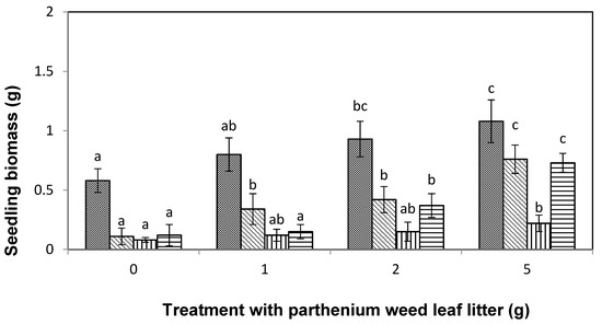 ) when sown into compost amended with different amounts of parthenium weed leaf litter (0, 1, 2, and 5 g) for 30 days. Error bars represent two standard deviations from the mean as calculated for three replicates of three seedlings. Means within each treatment that do not share the same letter are significantly different from one species to another at p > 0.05.