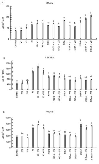 Iodine contents in grain (A), leaves (B), and roots (C) of sweetcorn plants. Means followed by different letters for treatments differ significantly p < 0.05 (n = 8). Bars indicate standard error.