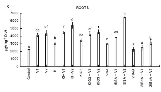 Vanadium and iodine are well known to be beneficial elements for higher plants. Vanadium’s ability to stimulate positive effects on plants at low concentrations was confirmed, as were the toxic effects of higher doses of vanadium on plants. The biological and physiological properties of V also depend on V’s oxidation state. Vanadium exists in several oxidation states from −1 to +5 [33]. For peppers cultivated in a hydroponic system with the addition of vanadium into the nutrient solution at a concentration of 5 μmol·dm−3, V significantly increased the growth of the aerial part of the plant, stimulated the development of flower buds, and accelerated the blooming of the pepper. The contents of amino acids and sugars in the roots and leaves of the pepper were significantly higher after the application of 5 μmol·dm−3 of vanadium [34]. The dry matter content of mint roots increased significantly after vanadium application at the corresponding doses of 10, 20, and 40 mg V·dm−3 [35]. Vanadium caused a decrease in biomass and inhibited the development of the root system in the cultivation of chickpeas, indicating the toxic effect of this element in applicable doses [36]. Application of the vanadium to the nutrient solution at a dose of over 40 mg·dm−3 was used to retard the growth of Chinese green mustard (B. campestris ssp. Chinensis var. Parachinensis) and tomato [37]. Several studies have confirmed that the accumulation of vanadium is much higher in the roots than in the above-ground vegetative and generative parts of the plant [33,36,37].