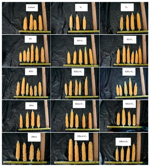 The stimulating effect of vanadium at low doses was confirmed in the cultivation of peppers [34]. A 5 μmol V·dm−3 dose of vanadium increased the plant height, stem diameter, number of leaves and flower buds, volume of roots, and weight of fresh and dry pepper biomass. Higher concentrations of vanadium (i.e., 10 and 15 μmol·dm−3 V) had a negative effect on pepper plants [34]. Smoleń et al. [21] conducted an experiment on hydroponic lettuce cultivation using organic (5-ISA and 3,5-diISA) and inorganic (KIO3) iodine compounds at the same dose of 10 μmol I·dm−3 and in combination with four different doses of vanadium (0.05, 0.1, 0.2, and 0.4 μmol V·dm−3). The addition of organic iodine compounds to the medium (5-ISA and 3.5-diISA) reduced the size of the lettuce head by 7.5 times compared to the control object, and the object with KIO3 applied at the same dose. The specificity of hydroponic cultivation is also important, where the iodine compounds are added to the growing medium and supplied throughout the period of growing lettuce. This previous study used seven soil applications for the cultivation of maize.