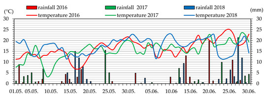 Average daily values of air temperature and precipitation in May and June 2016–2018 in Blinów II.