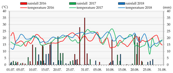 Average daily values of air temperature and precipitation in July and August 2016–2018 in Blinów II.