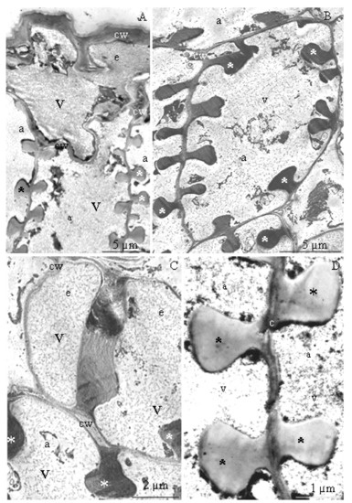 (A–D). Epidermis (A) and anther endothecium (A–D) cells in R. idaeus ‘Glen Ample’ (A), ‘Laszka’ (B), ‘Polka’ (C), ‘Pokusa’ (D): (A)—epidermis (e) and endothecium (a), visible thick outer epidermis cell wall (cw), regular thickenings of the endothecium cell walls (asterisks), vacuole (v), (B)—endothecium cells, visible anti- and periclinal cell walls (cw) with characteristic thickenings (asterisks), vacuole (v), (C,D)—epidermis (e) (Figure 7C) and endothecium (a) (Figure 7C,D) cells, visible thickenings (asterisk) of the endothecium cell wall (cw), vacuole (v); (A–D)—TEM.