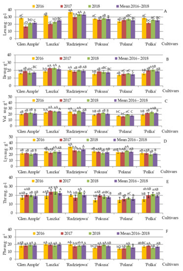 The average content of isoleucine in ‘Laszka’ was comparable to that found in ‘Radziejowa’ and significantly higher than in the other cultivars. Its amount in ‘Radziejowa’, ‘Glen Ample’, Pokusa’, and ‘Polka’ significantly exceeded the levels detected in ‘Polana’. The content of this amino acid in ‘Glen Ample’, ‘Laszka’, ‘Polka’, and ‘Pokusa’ was markedly higher in 2017 and 2018 than in 2016. The comparison of the differences between the cultivars in the study years revealed a significantly higher level of isoleucine in ‘Laszka’ and ‘Radziejowa’ than in the other cultivars in 2016. In turn, in 2017 and 2018, its content was clearly higher in ‘Laszka’ than in the other cultivars, whereas ‘Polana’ was characterized by substantially lower levels of this amino acid in comparison with ‘Glen Ample’, ‘Radziejowa’, ‘Pokusa’, and ‘Polka’ (Figure 9B).
