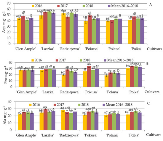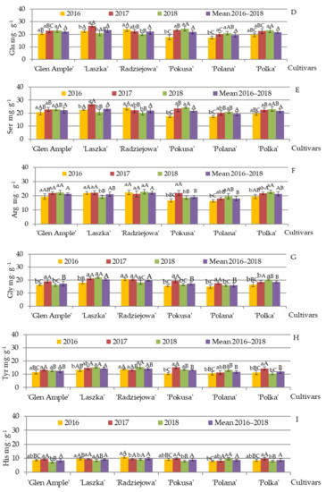 The pollen of ‘Laszka’ had significantly higher valine content than ‘Glen Ample’, ‘Pokusa’, ‘Polka’, and ‘Polana’, with the lowest amount of this amino acid in ‘Polana’. A markedly lower valine amount was determined in the pollen from ‘Laszka’, ‘Pokusa’, and ‘Polka’ in 2016 than in 2017 and 2018. The comparison of this amino acid content between the study years demonstrated its lower level in the second year in ‘Radziejowa’ and ‘Polana’. In terms of the differences between the cultivars in the individual years, the valine concentration was higher in ‘Laszka’ and ‘Radziejowa’ than in the other cultivars. Furthermore, its content in ‘Polana’ was significantly lower than in ‘Pokusa’, ‘Polka’, and ‘Glen Ample’ (Figure 9C).