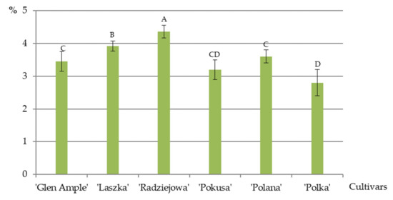 Percent content of total protein in pollen from six R. idaeus cultivars.