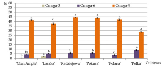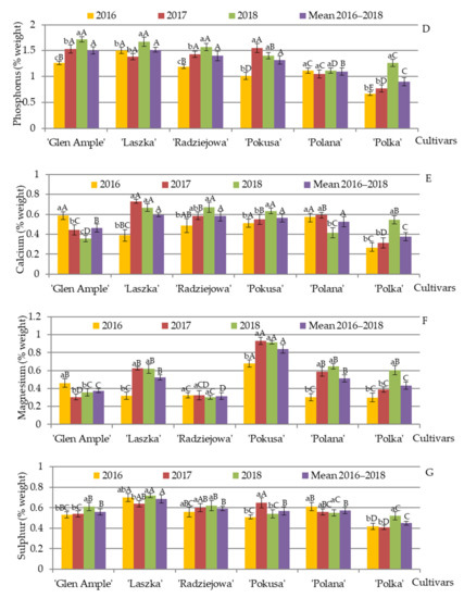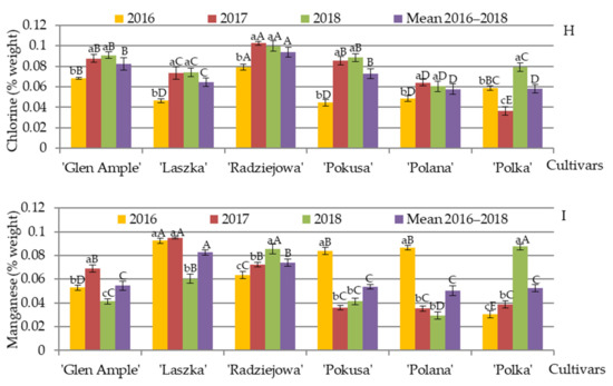 A significantly lower level of lysine was detected in the pollen from ‘Glen Ample’ and ‘Polka’ than from ‘Radziejowa’. The content of this amino acid declined substantially in ‘Radziejowa’ in 2017 and 2018, compared with 2016, and increased markedly in the ‘Polana’ cultivar between 2017 and 2018. The comparative analysis between the cultivars in the individual years showed significantly higher lysine content in ‘Radziejowa’ in 2016, whereas significant differences were found in 2017–2018 only between ‘Radziejowa’ and ‘Glen Ample’ (Figure 9D).
