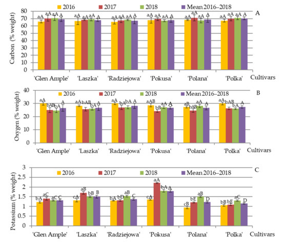The microanalysis of elements in pollen grains was performed with the energy dispersive X-ray technique using a Bruker X-Flash Energy Dispersive Spectroscopy (EDS) detector, model X-Flash 123 eV coupled with a Zeiss Ultra Plus scanning electron microscope (Zeiss, Oberhofen, Germany). The elemental analyses were performed on the surface of 25 randomly selected pollen grains from each cultivar at a live time of 120 s, a dead time of less than 1%, and 20 keV beam energy. At this energy, the electron beam penetrated the pollen grain wall to a depth of 2 µm. After collecting the spectrum, the data were collected and converted mathematically using the standardless method; the results were expressed in weight percent (wt. %).
