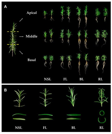 (A) Morphological differences in apical, middle, and basal rosemary cuttings irradiated by different light sources—natural sunlight (NSL), fluorescent lamp light (FL), blue light (BL), and red light (RL)—at 4 weeks. (B) Morphological changes of young leaves on apical cuttings.