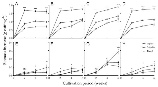 Biomass increase of (A–D) shoots and (E–H) roots among apical, middle, and basal rosemary cuttings irradiated with (A,E) natural sunlight, (B,F) fluorescent lamp light, (C,G) blue light, and (D,H) red light for six weeks. Error bars indicate the mean ± SE from three replicates (n = 8). Asterisks over data points indicate significant differences at p < 0.05 (*), <0.01 (**), and <0.001 (***); not significant; ns. There were statistical differences in the increase of shoot fresh weight among cutting positions (p < 0.001), and in the increase of root fresh weight among light conditions (p < 0.01) and culture period (p < 0.01).