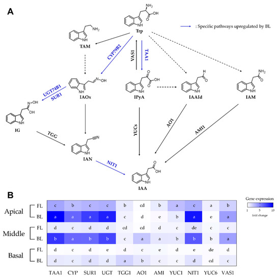 (A) Tryptophan (Trp)-dependent pathways for indole-3-acetic acid (IAA) biosynthesis in plants and (B) relative gene expression levels in apical, middle, and basal positions of rosemary cuttings treated with fluorescent lamp light (FL) or blue light (BL) for 7 days. Solid and dashed arrows indicate processes for which genes are known and unknown, respectively. Blue arrows indicate pathways specifically upregulated in BL-treated rosemary cuttings. Alphabets in heatmap mean statistical differences in gene expression among treatments within the same gene (p < 0.05).