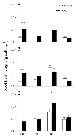 The effects of both light quality and NAA treatment on the root growth of rosemary cuttings are shown in Figure 4. Under NSL, the root fresh weight increased with NAA treatment in all cutting positions. In particular, the root fresh weight of apical and middle cuttings was improved with NAA treatment by 2.7- and 2.8-fold, respectively (p < 0.001). FL + NAA treatment also increased root fresh weight, but the difference was not significant. Exposure to a single wavelength (BL or RL) + NAA treatment only increased the root fresh weight of the basal cuttings. BL + NAA treatment significantly increased the root fresh weight (1.5-fold higher) compared with BL treatment (without NAA) in basal cuttings (p < 0.05). The accumulation of carbohydrates and some root-promoting substances in lignified stems improves rooting capacity compared with semi-hardened and non-lignified green stems [4,40,41,42]. Therefore, an increase of root biomass was observed in basal rosemary cuttings regardless of light conditions (Figure 4). In particular, the treatment with BL and NAA was more effective at increasing root biomass than BL treatment without NAA, as reported by Gil et al. [7]. NAA is an exogenous auxin that induces adventitious roots in soft green stems [39]. Therefore, the apical and middle cuttings with less lignification, compared with basal cuttings, may have responded sensitively to the NAA treatment and increased their root fresh weight. The positive effects on root fresh weight increase by NAA treatment were higher under NSL than under artificial light. Thus, NAA treatment is recommended when using NSL to propagate rosemary stem cuttings.