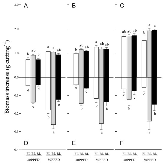 (A–C) Shoot and (D–F) root growth of (A,D) apical-, (B,E) middle-, and (C,F) basal-position rosemary cuttings irradiated with different photosynthetic photon flux densities (PPFDs) of fluorescent lamp light (FL), blue light (BL), and red light (RL) for 4 weeks. Error bars indicate the mean ± SE from three replicates (n = 8). Different letters indicate statistical differences determined by Tukey’s HSD test at p < 0.05.