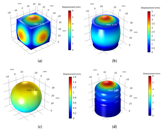 An example of the inflation behavior of 30 mm geometries with 3 mm walls under an internal pressure of 50 kPa. (a) Cubic geometry. (b) Cylindrical geometry. (c) Spherical geometry. (d) Bellows-based geometry. As can be observed in (a) and (b), part of the air flow is wasted on the expansion of the walls to different degrees depending on the geometries, which does not contribute to the forward displacement. This method does not seriously affect sphere-based geometry, but due to manufacturing criteria, bellows-based geometry is an important option to consider.