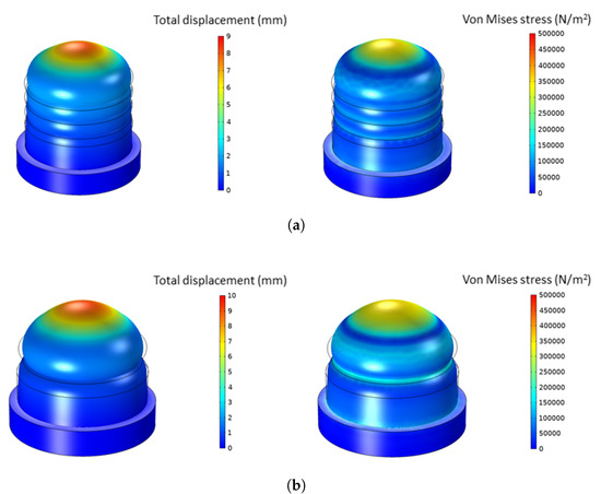 Model showing the displacements reached and the von Mises stress under 50 kPa pressure: (a) 4-bellows soft actuator; and (b) 2-bellows soft actuator.