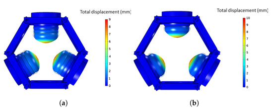 Model showing the displacements reached on the actuators of the soft gripper with hexagonal configuration under constant pressure: (a) 4-bellows soft actuator; (b) 2-bellows soft actuator.