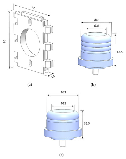 This article aimed to go one step further and advance in modularity and scalability to achieve a quasi-universal gripper concept adaptable to each fruit. To this end, a 3D-printed module is designed and made of polylactic acid (PLA), which is one of the best-known synthetic biodegradable polymers, with good mechanical strength and low toxicity. Its faster degradation makes it an environmentally friendly option compared to traditional plastics [57]. As higher toughness is desired for durable applications, research progress on toughening PLA based on plasticization, copolymerization, and melt blending with different tough polymers, rubbers and thermoplastic elastomers can be found in several recent review articles [58,59,60,61,62,63,64]. In addition, many PLA formulations with improved toughness are available in the market for durable applications, as summarized in [65]. The proposed PLA structure has the following advantages. First, the module is independent of the gripper; i.e., it can work on its own and make the gripper adaptable to a wide variety of tasks. Second, the gripper is interchangeable, which makes it deeply reliable. This novel feature is an advantage over other soft grippers, which are usually formed in a single body configuration. Therefore, if any failure occurs in these devices, it is necessary to change the entire gripper. Third, this module is completely replicable: as both the rigid components and the mold of the soft components can be easily 3D printed, the materials used for their manufacture are fully available and inexpensive, and there is no need for the postprocessing of the parts. The main parts of the soft gripper module can be seen in Figure 4.
