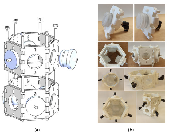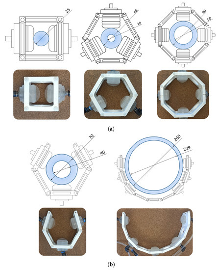 Once the soft actuator is manufactured and the rigid components are printed with a 10% infill, the soft part is inserted into the hole of the rigid structure and attached to it via a screwed clip. With all this, the standalone module is fully assembled. To mount the modules for different gripper configurations, nylon threaded rods, washers and nuts can be used (see Figure 7a). The preference for the use of nylon fasteners is due to their low-density property, which is useful for lightweight robotic manipulators. However, it can be replaced by steel if the application requires it. A fully assembled module and some examples of soft grippers’ configurations are shown in Figure 7b.