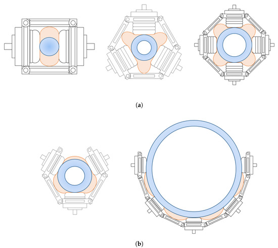 One of the main advantages of the proposed design approach is that it allows the rigid structures of the modules to be assembled following various geometries that facilitate the positioning of the soft actuators to ensure sufficient contact areas that provide stable grips for different types of fruits. Figure 8 shows that due to the proposed design, even other grips, different from the ideal one (i.e., one in which the fruit is centered at the midpoint of the gripper) are equally feasible. If the object (represented by the blue areas in Figure 8) and the closed configuration gripper are concentric, all the actuators will be involved in the grasping. On the contrary, if the target is located in other areas, such as in the orange areas, the grasping could be carried out by means of only two actuators.