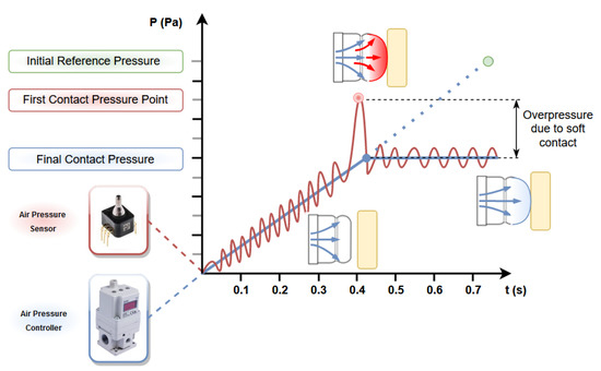 Furthermore, as can be seen in Figure 9, the soft actuators can operate automatically via proportional–integral–derivative (PID) control, where the feedback is the internal pressure measurement provided by the pressure sensor located at the inlet of the soft actuator. This controller reads the pressure change with a frequency of 50 Hz, and if its rate of change is greater than that caused by the electropneumatic regulator, it means that the soft actuator is in contact with the object due to the decrease in the volume of the gripper and the increase in the actuator internal pressure (see the red point in Figure 9). This makes it possible to monitor the contact of the soft actuator without sensors embedded in it.