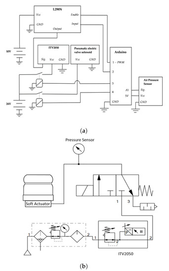 Electric and pneumatic systems. (a) Electric scheme of the modular soft grippers. (b) Pneumatic scheme.