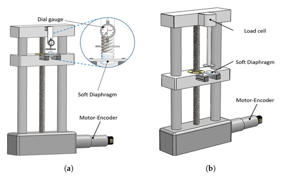 Devices for measuring the soft actuators features. (a) Assembly of the dial gauge to measure the displacements in the soft diaphragm. (b) Assembly of the load cell to measure the contact force in the soft diaphragm.